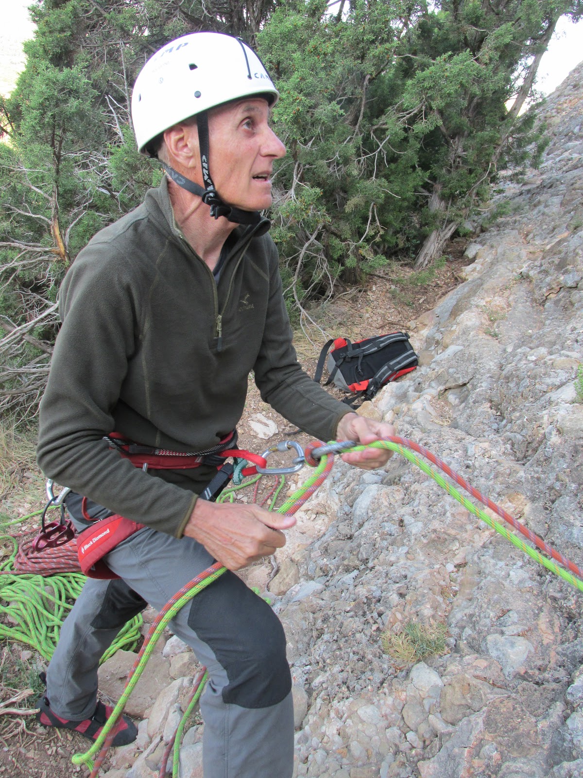 Largo 1 (IV, 35m): Empieza por el espolón a la izquierda de la chimenea, superando una sucesión de bloques hasta alcanzar una plataforma donde se hace la primera reunión.